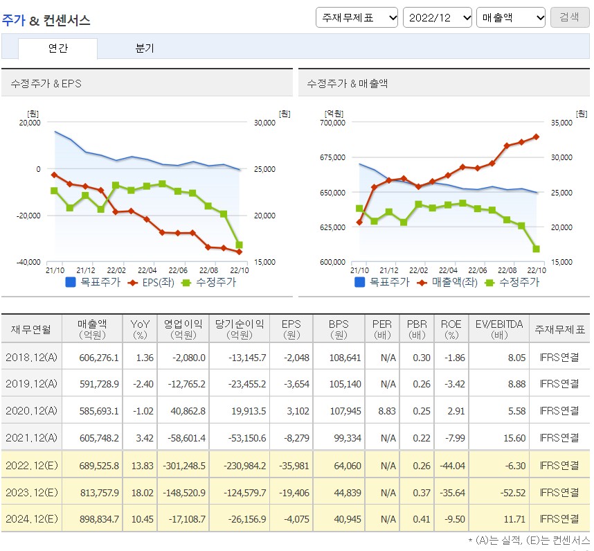 컨센서스를 보면 목표주가 또한 지속적으로 하락하고 있는 것을 볼 수 있다. 물론 현재 전 세계적으로 장이 좋지 않은 점도 영향은 있을 것이라고 본다.